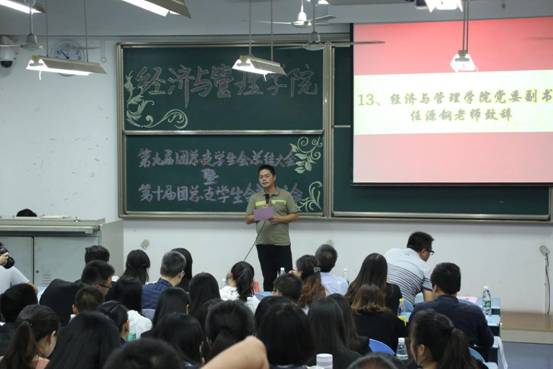 紧接着,陈序作为第九届团总支学生会干部代表对过去一年学生会的工作进行了总结并对于新的一届学生会寄予了他最真心的祝福。团总支书记朱旭森老师宣读了第九届团总支学生会干部名单并颁发了聘书,给予了他们工作的肯定与鼓励,接下来辅导员罗昭阳老师和唐爽老师分别宣读了各学年度各班的班长与团支书的名单以及第十届团总支学生会干部名单,胡雪梅老师和任源钢老师分别为其颁发了聘书并与其合影留念。希望他们可以在新的学年周期里继续做好带头作用,让优秀成为一种习惯。第十届团总支学生会干部代表苑琛琛的发言,表明会继承发扬往届的优良学风,壮大第十届学生会队伍,刻苦攻坚,展望未来。
