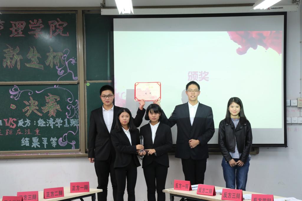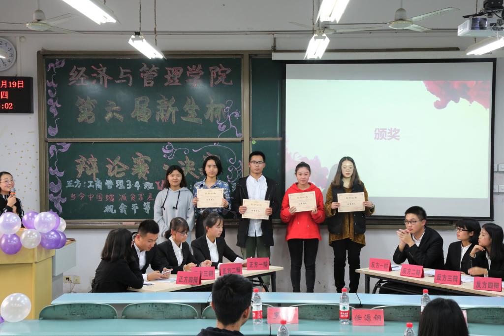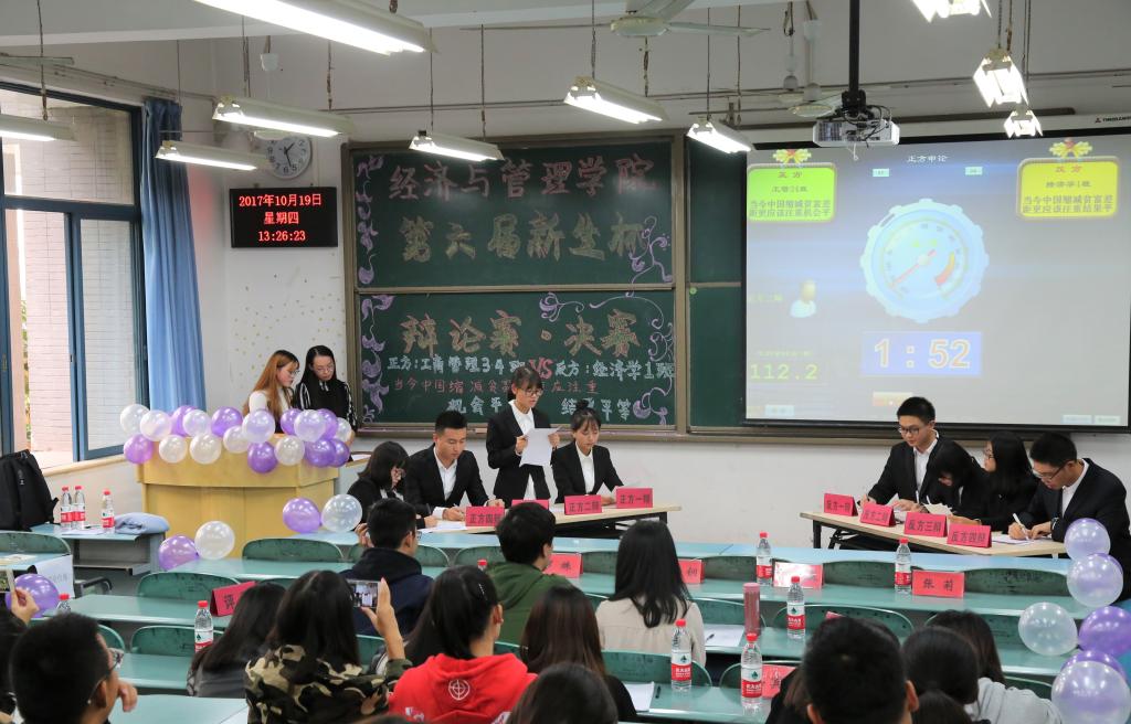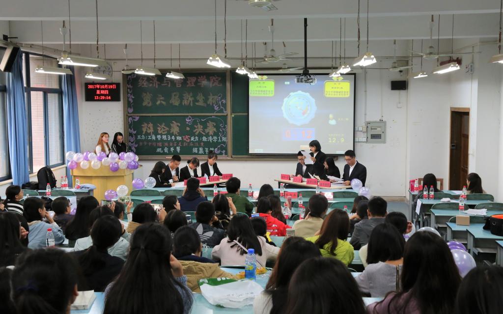 为丰富2017级新生的课余活动,培养同学们的思辩能力和语言表达能力,同时也为学院辩论队遴选辩论精英。我院举办第六届“新生杯”辩论赛,经过初赛、复赛的激烈角逐,来自工商管理3、4班与来自经济学1班的两支辩队凭借清晰的思路以及自信的谈吐成功进入决赛。10月19日下午13点,辩论赛决赛于弘德楼15101教室举行。重庆大学城市建设与环境管理工程学院辩论队队长丁桐、我院第九届辩论队队长吴希培、我校辩论队副队长江城川受邀担任评委,我院第十二届团总支学生会主席冯欢、书记何丹以及学生会部分成员到场观看比赛。此次辩论赛吸引了同学们的广泛关注,现场人头攒动。