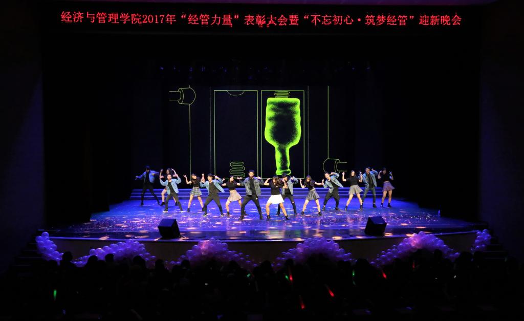 晚会前的暖场视频展现出经管学子的青春风采以及两个月来高强度排练的不易,也将现场观众带入欢快愉悦的气氛中。首先进行的是“经管力量”表彰大会,大会中宣读我院2017年优秀团体、教师、学生的卓越成就及其获奖概况并对优秀师生进行表彰。随后,党委书记致辞,税书记对学院近年来取得的成果表示充分肯定,赞扬师生们为了学院能够更好地发展所作出的不懈努力,税书记的慷慨陈词激起师生对作为经管人的自豪感。