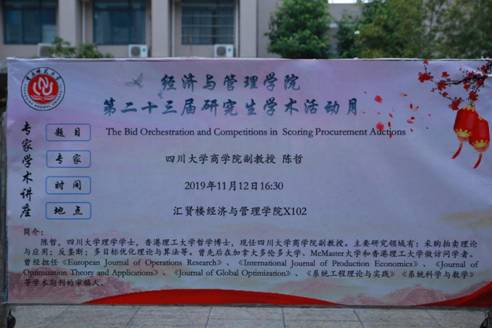 2019年11月12日16:30,2138cc太阳集团第二十三届学术活动月第一场学术讲座在汇贤楼2138cc太阳集团X102举行,出席本次讲座的专家是四川大学商学院副教授陈哲,讲座的题目为”The BidOrchestration and Competitions in Scoring Procurement Auctions”。2138cc太阳集团全体研究生聆听了此次讲座。