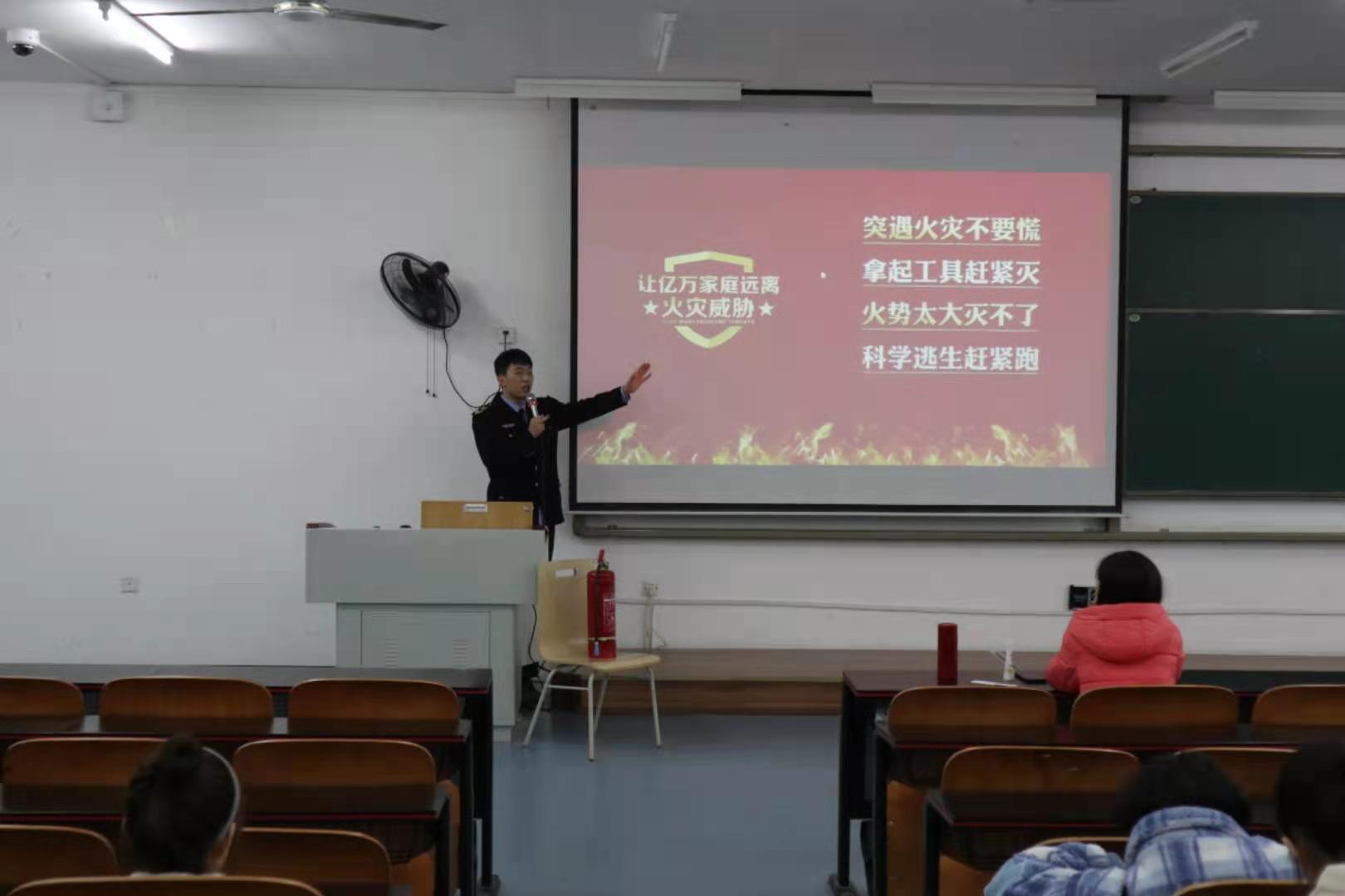首先,傅玉年教官结合典型视频案例,介绍了火灾初起、发展、猛烈、衰退、熄火等五个发展阶段,讲解了日常生活和工作中火灾发生的原因、火灾所造成的严重后果,并就如何预防火灾、如何在火灾现场逃生自救以及如何充分利用和操作灭火器等现代消防设施设备自救方面做出了详细指导。
