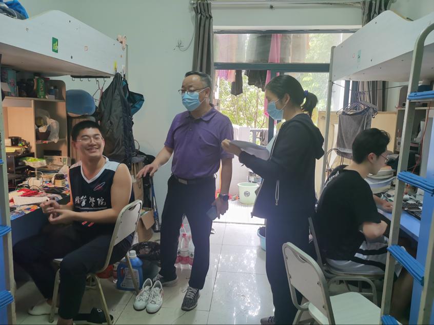 学院第一时间成立了以党委书记和院长为组长的疫情防控工作领导小组,建立了全体小组成员微信工作群,通过“线上+线下”工作例会的方式,压实各级组织责任,为疫情防控筑牢防线。3月11日至20日,学院领导数次带领辅导员不分昼夜全覆盖巡查学生寝室500余间,排查隐患,了解学生困难。圆满完成我院师生日常封控管理信息报送、七天四次全院师生核酸采样落实、配合转运隔离师生等工作,织密铸就了全院师生疫情防控“命运共同体”。