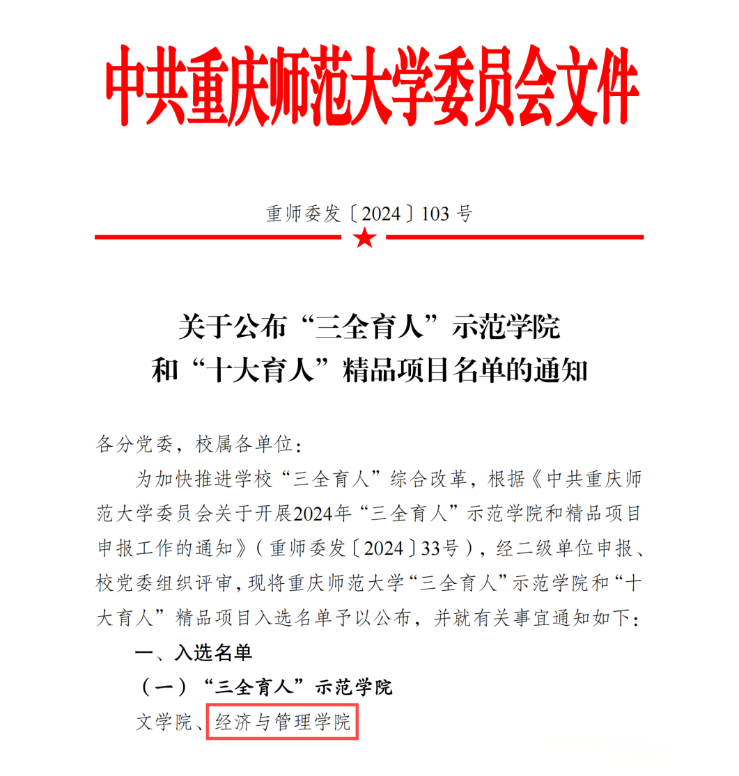 近日,中共2138cc太阳集团委员会公布了2138cc太阳集团“三全育人”示范学院和“十大育人”精品项目入选名单,我院成功入选2138cc太阳集团“三全育人”示范学院。示范学院和精品项目以二级管理单位为主,建设周期为两年,学校将分别给予专项建设经费支持并分年度划拨,用于项目实施推进,完善优化和成果转化推广等。
