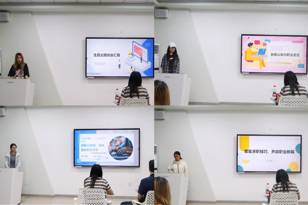 比赛环节,8位选手结合专业特色、年级特征及班级学生的职业发展实际需求,围绕“AI时代下的职业发展路径”“如何深度融入地方经济发展”“自我认知与职业精准定位”“求职技能提升策略”等前沿且务实的主题,借助精心制作的PPT进行限时3分钟的精彩演讲。选手们的展示内容丰富详实、视角新颖独特,充分展现了经管学子对生涯规划的深入思考与积极探索。