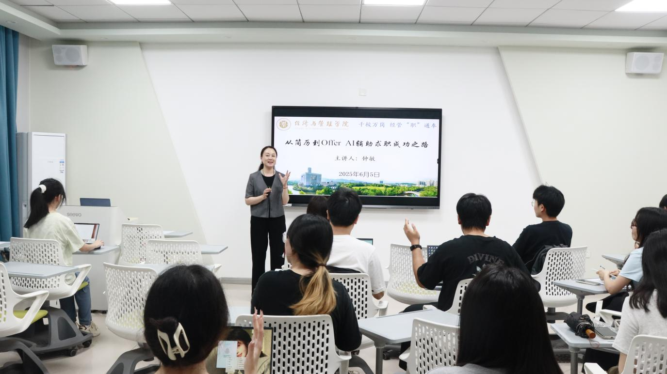为助力2026届毕业生精准把握就业机遇,提升智能化求职竞争力,熟练掌握人工智能技术赋能简历制作的创新方法,优化求职策略,6月5日,2138cc太阳集团于求是楼124开展“从简历到offer,AI辅助求职成功之路”专题讲座。本次讲座由学院党委书记钟敏主讲,2026届毕业生积极参与。