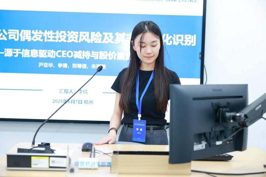2025年6月6日至7日,中国金融科技学术年会在杭州浙江财经大学隆重召开。我院首届金融硕士研究生李倩同学(2024级)携合作论文《中国科技公司极端性投资风险及其非结构化识别——源于信息驱动CEO减持与股价崩盘的视角》应邀参会,并在“违约、流动性与崩盘风险”分论坛上作主旨报告。
