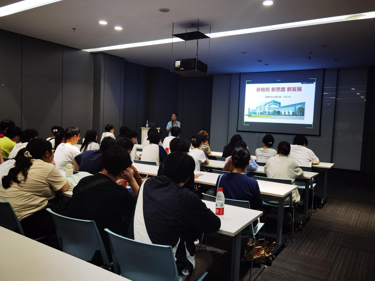 抵达蓝黛科技集团股份有限公司后,集团人力资源部徐梅总监、戴霜专员热情地接待了师生,详细地为同学们介绍了企业的发展历程、业务范围、用人理念以及企业文化等,和同学们就HR六大模块在企业的实践以及三支柱的应用进行了深入地交流。
