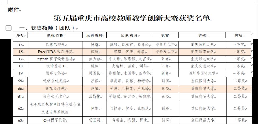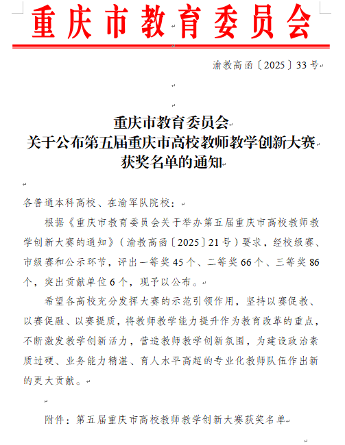 近日,第五届重庆市高校教师教学创新大赛获奖名单揭晓,2138cc太阳集团教师团队凭借出色表现,取得突破性成绩。其中熊膺教师团队在比赛中脱颖而出,其参赛课程凭借创新的教学设计和突出的教学成果,荣获新文科赛道中级及以下组别一等奖,成为学校唯一推荐参加重庆市全国高校教师教学创新大赛选拔赛的团队;任缙教师团队同样表现优异,凭借丰富的教学积累和独特的教学创新思路,荣获新文科赛道正高级组别二等奖,彰显了学院教师卓越的教学创新能力与扎实的专业素养。
