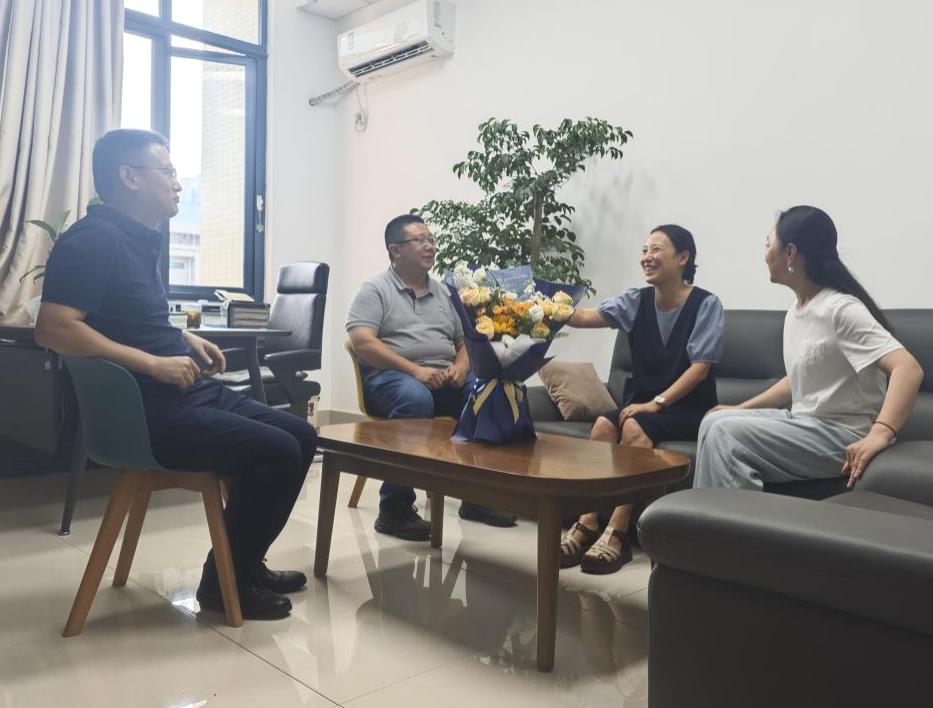 在第41个教师节来临之际,为营造尊师重道的浓厚氛围,表达对高层次人才的深切关怀与崇高敬意,9月10日、11日,学院党委书记钟敏、党委副书记、执行院长郑景丽带领党政领导班子,逐一走访学院省部级以上人才工作室,向他们致以节日的诚挚问候和美好祝福。学院领导与各位专家亲切交谈,细致询问了他们的工作进展、团队建设以及生活中的实际困难,并就学院的人才政策、科研生态和未来发展进行了深入交流。