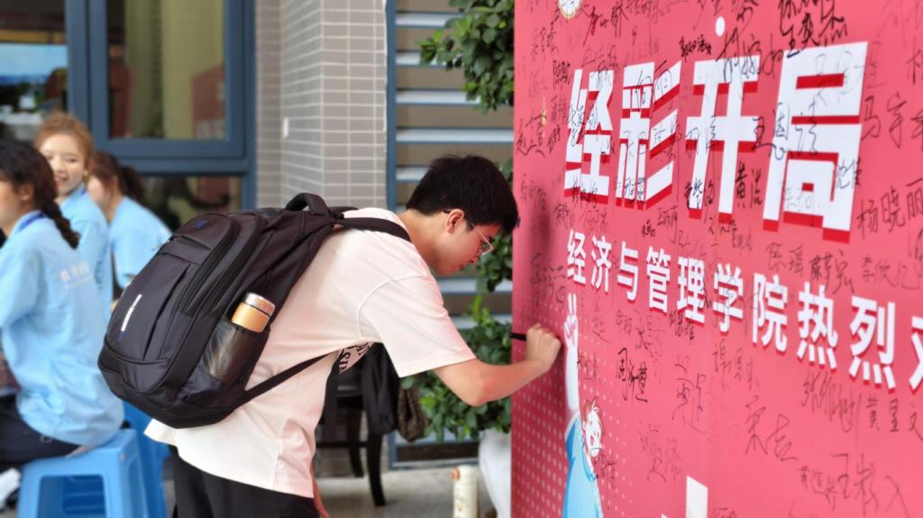 16日清晨,学院迎新点早已布置得温馨而醒目。在学院设置的迎新接待处,新生依次完成资格审查、学籍注册等报到手续。现场特别设置的签名墙与抽奖区吸引了众多新生参与,同学们纷纷留名纪念并积极参与互动活动。志愿者们身着统一服装,以专业的态度和热情的服务为新生提供全流程引导,确保报到工作的高效进行。