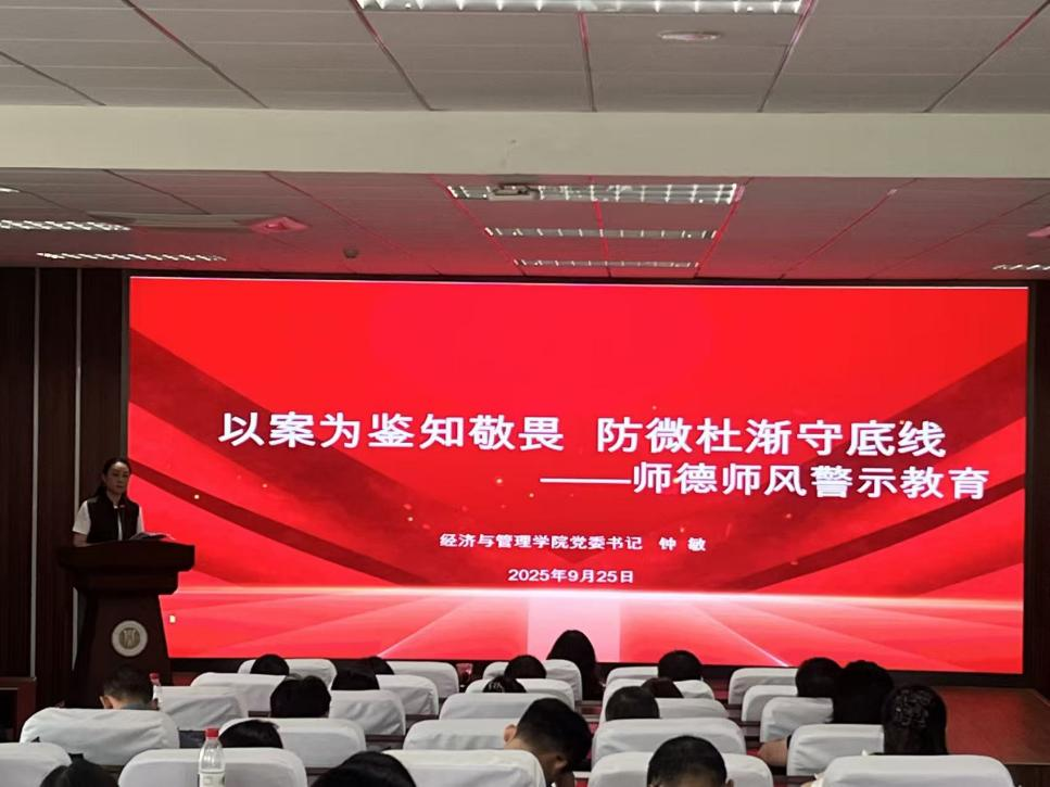 学院党委书记钟敏以“以案为鉴知敬畏,防微杜渐守底线”为题开展师德师风警示教育,通过剖析意识形态、师生关系、学术不端等方面的典型案例,提醒教师严守职业底线,强化自我约束。临近中秋、国庆双节,她还就师生安全教育与管理工作作出部署,要求教师和辅导员切实履行责任。