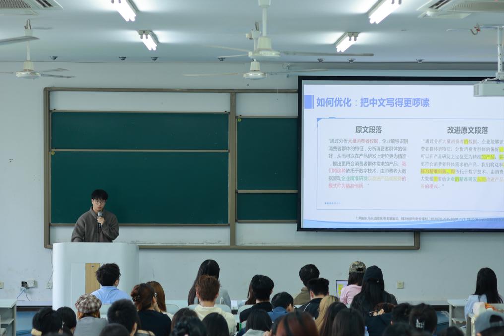 吴坚同学以“学术写作语言与工具选择”为主题,系统讲解写作实践中的语言使用与技术支持。他指出需根据研究对象与发表需求灵活使用中英文写作,结合实例剖析中文学术写作中表达不规范、逻辑不连贯等常见问题,并给出改进方法。同时,他结合自身论文写作经历,分享了注重逻辑结构、突出创新点、反复修改完善等实用建议,并推荐Bing、Grammarly、百度翻译等翻译润色工具,助力提升写作效率与语言质量。