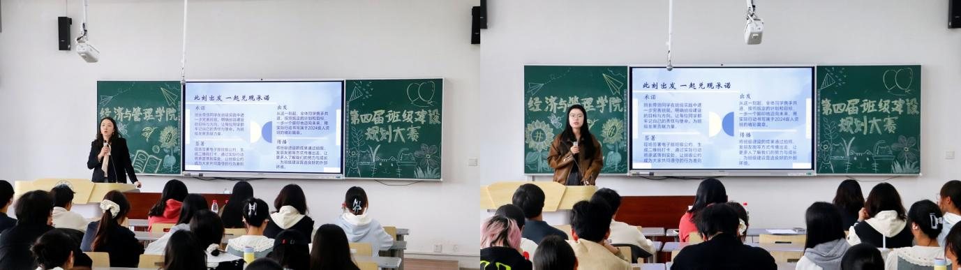 决赛现场,各班参赛队伍依次登台,围绕班级基本情况、建设理念和未来发展目标等板块进行系统阐述,通过精心制作的PPT和精彩演讲,全面展示了班级特色风貌与建设蓝图,彰显了经管学子积极向上的精神面貌。在答辩环节,评委老师就规划内容的可行性、创新性与代表性进行深入提问,并提出建设性意见。