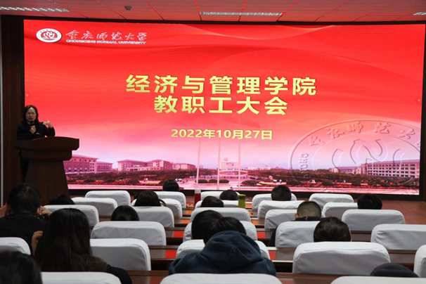 为更好的学习党的二十大报告,以党的二十大报告精神引领学院各项事业发展,2022年10月27日下午,2138cc太阳集团在求是楼517召开教职工大会。会议有两项议程,一是党委书记钟敏做“解读党的二十大报告 再看大学生就业”专题导学报告,二是学院领导总结布置近期工作。全体教职工参会。