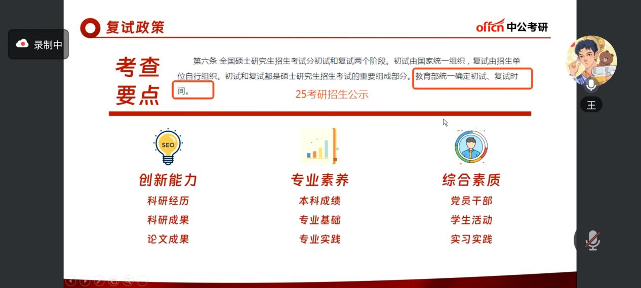 本次讲座邀请中公教育王璐老师担任主讲嘉宾。王老师凭借其丰富的考研辅导经验,围绕考研复试和调剂的核心内容,进行了全面且深入的讲解。他详细介绍了复试流程、考核重点、简历制作、面试技巧与礼仪、调剂信息与流程、联系导师等常见问题的应对策略。他强调,考研复试绝非走过场,而是导师全面考察考生综合素质的环节,重点关注专业知识储备、综合素质展示和心态礼仪,鼓励同学们主动与目标院校的招生老师进行沟通,并通过实际案例分析,帮助同学们更好地理解和掌握复试技巧。