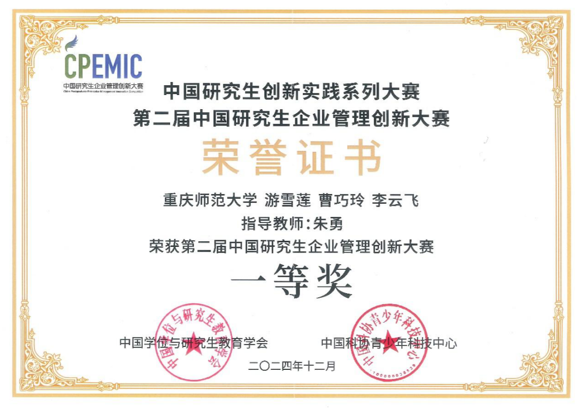 我院2024级MBA研究生游雪莲、曹巧玲、李云飞组成的团队,在朱勇教授的悉心指导和吕潮琳博士的带领下,凭借出色的创新能力、扎实的专业基础和默契的团队协作,在激烈的竞争中脱颖而出,荣获全国总决赛一等奖!