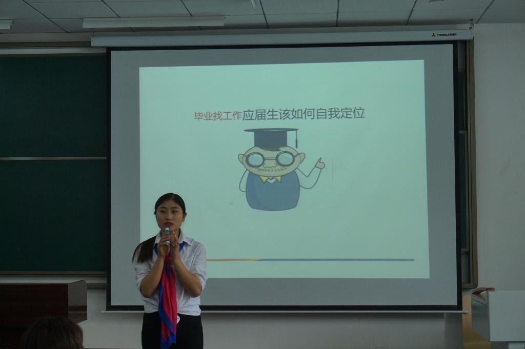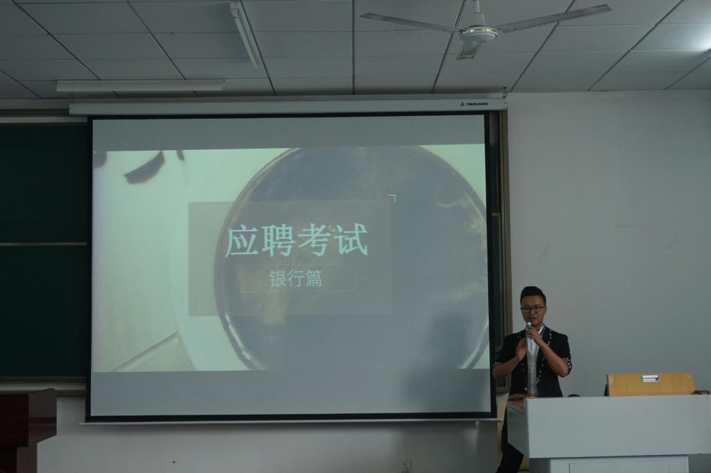 关于银行应聘考试方面,我院学子彭佳宇和文勇提出他们具有实际性意义的建议。他们不仅分析到当今银行业的就业前景良好,也告诫13级学生在银行应聘时要做足准备工作,避免出现失误。并强调在面试环节时,要平心静气,沉着应对试题,发挥好自己的实力。他们推荐的一些复习书籍和答题技巧对到场学生起到不容小觑的作用。在准备毕业后投入工作的学子来说,我院学生陈芬分享的关于她自己找工作时的一些经验方法作用甚多。她指出到场学生应该明确自己的目标与方向,着重培养自己的软实力,发展并提高自身综合能力,成就自我。