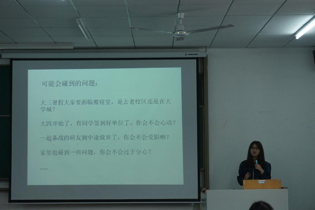 本次交流会中,六位毕业生分别就自己的经验心得做出分享,并解决了现场学生提出的问题,提出一些可靠且实用的建议。在考研方面,我院学生康梦楠、高盼、李诗昀分别结合自己的实际经历做出分享。她们指出考研应具有良好的心态,别轻言放弃;要养成良好的学习习惯,制定好每天的计划表,提高自身的学习效率;选择专业和学校时要慎重,要结合自己的实际情况出发,切勿好高骛远;要真正意义上的去学习,利用好考研资料,认真复习。同时,她们也推荐到一些很不错的学习软件、复习资料以及答题方法,给准备考研的学子们起到一个良好的带头作用。