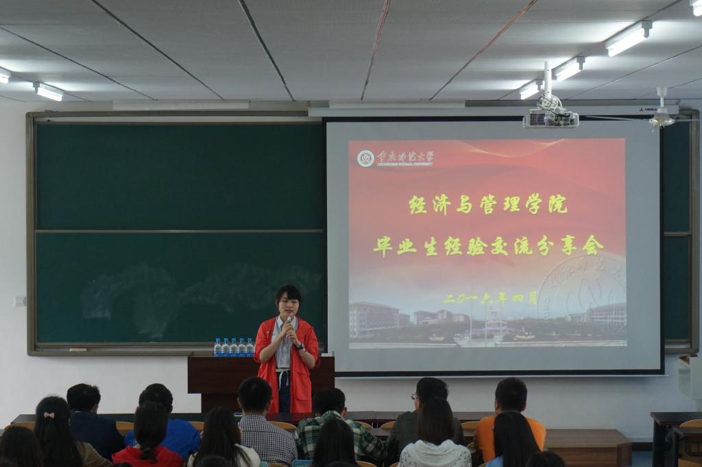 经验促发展,心得助进步。4月21日下午2点半,我院在特教楼2302和2309教室顺利举行2012级毕业生经验交流会。本次交流会由我院朱旭森老师主持,2012级学生康梦楠、高盼、彭佳宇、陈芬、文勇以及李诗昀应邀分享自身的经验心得与考研方法。我院2013级全体学生到场聆听学习。
