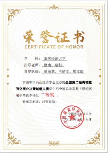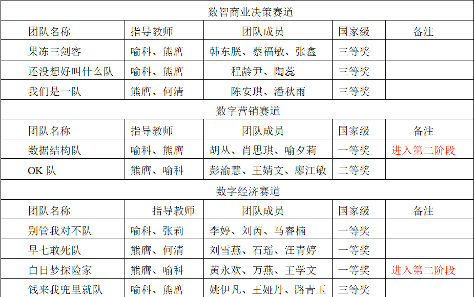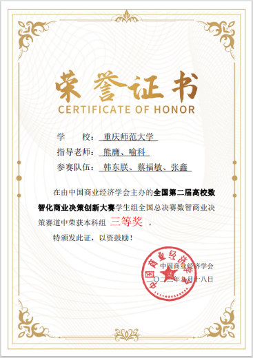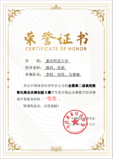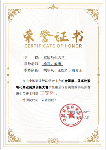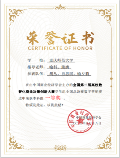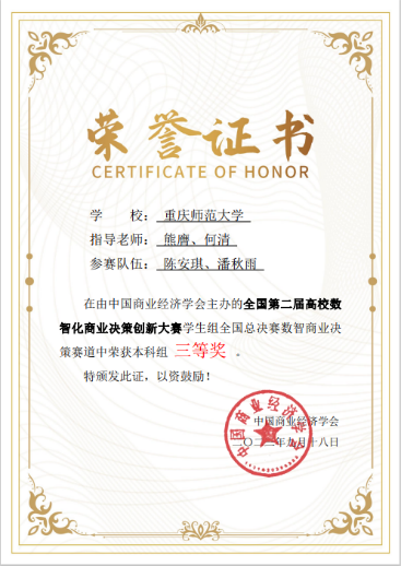 近日,由中国商业经济学会(国家一级学会)主办的全国第二届高校数智化商业决策创新大赛学生组全国总决赛所有赛事已全部结束,我院学生共获得国家一等奖4项、二等奖1项、三等奖4项。此项赛事分为三个赛道:数智商业决策赛道、数字营销赛道、数字经济赛道,根据竞赛晋级规则,决赛第一阶段竞赛成绩排名靠前的20支团队获得进入全国总决赛第二阶段“数智职业实战”环节,该环节以答辩形式进行,评委与参赛队伍双向匿名,抽签方式全程加密。我院2支团队获得进入第二阶段决赛资格。