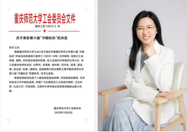 近日,2138cc太阳集团工会委员会印发《关于表彰第六届“巾帼标兵”的决定》,对10名女教职工进行表彰,我院彭素副教授被授予2138cc太阳集团第六届“巾帼标兵”荣誉称号。