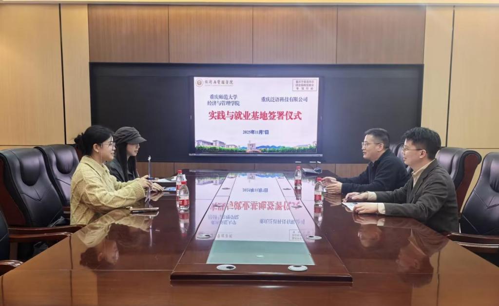 为深化校企合作,拓宽学生实践与就业渠道,11月7日,我院与重庆泛语科技有限公司举行了实践与就业基地签约仪式。学院副院长段俊、重庆泛语科技有限公司人事代表钱坤、郑含玉、学院辅导员张源出席签署仪式。