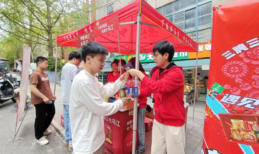分享过程中,作为企业代表的毕业生同学们积极向在校生宣传推广自己应聘企业的产品“乌江榨菜”,分别从口感、味道等进行了详细介绍,并热情邀请路过的同学们品尝;同时,为使学生更加了解自己所在的企业单位,在场毕业生同学们还就涪陵榨菜集团的工作环境、工作氛围等进行了简要介绍。