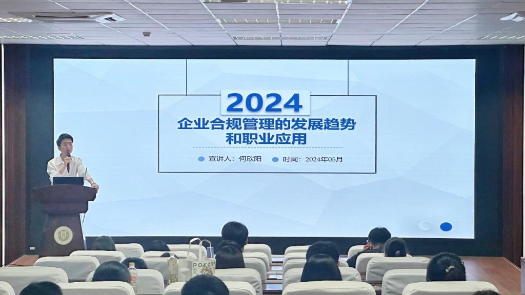 讲座中,何欣阳老师从企业合规管理的发展趋势和职业应用出发,围绕“认识企业合规、企业合规的独特价值、案例分享、企业合规的现状及未来趋势”四个方面,系统阐述了企业合规管理的重要性,揭示了企业合规的价值意义。同时,他指出,企业合规师作为一个新兴职业,有着非常可观的发展前景,涉及领域包括数据合规、数据安全、安全生产等,该行业目前人才缺口仍旧较大,具有较丰厚的待遇,同学们可将其作为就业选择之一。
